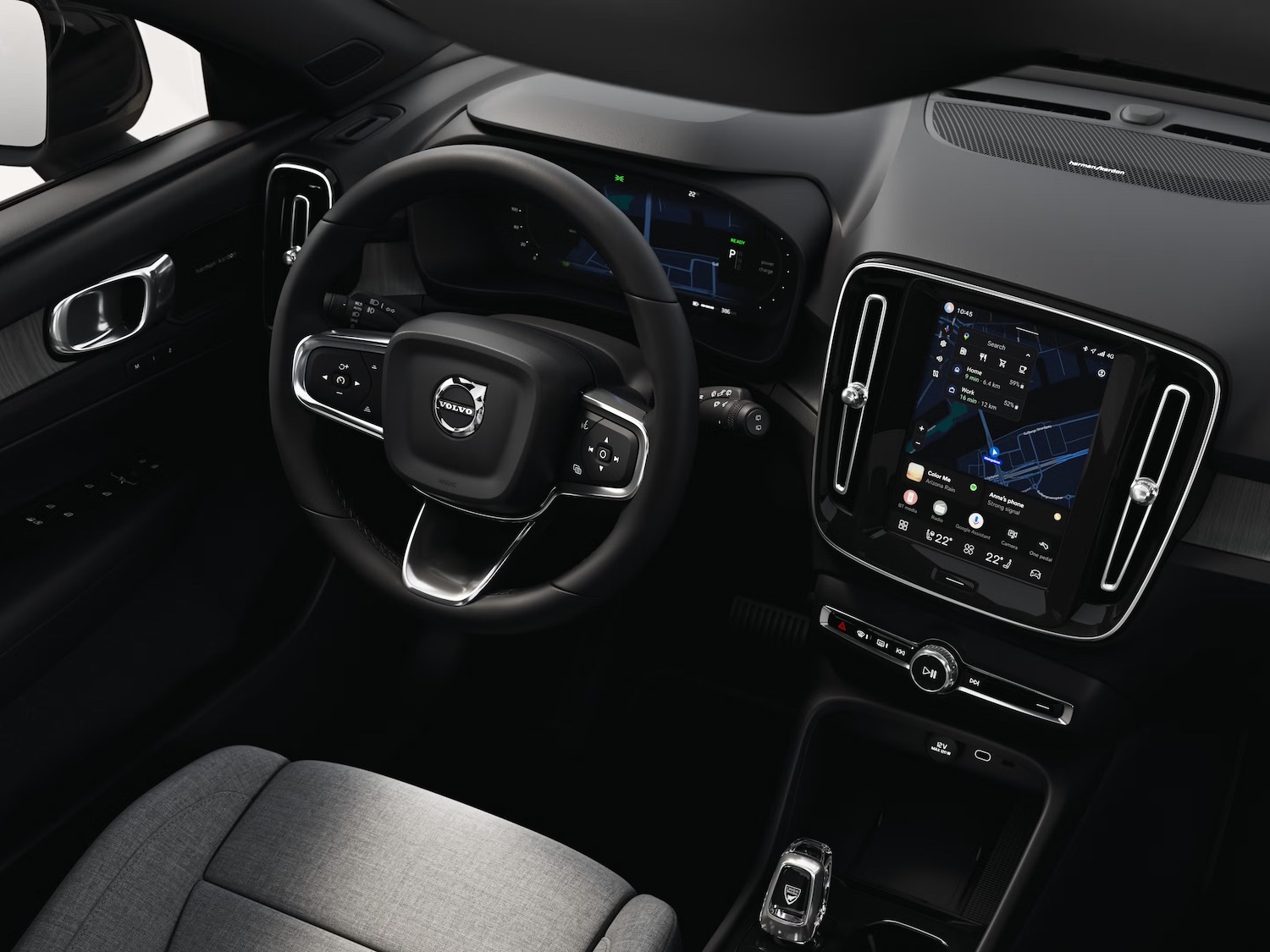 The EC40 cockpit extends the clean Scandinavian minimalism of the exterior design. Nothing is superfluous. Everything is where you expected it to be, from the driver and centre displays to thoughtfully placed storage for bags, devices and life’s little extras.