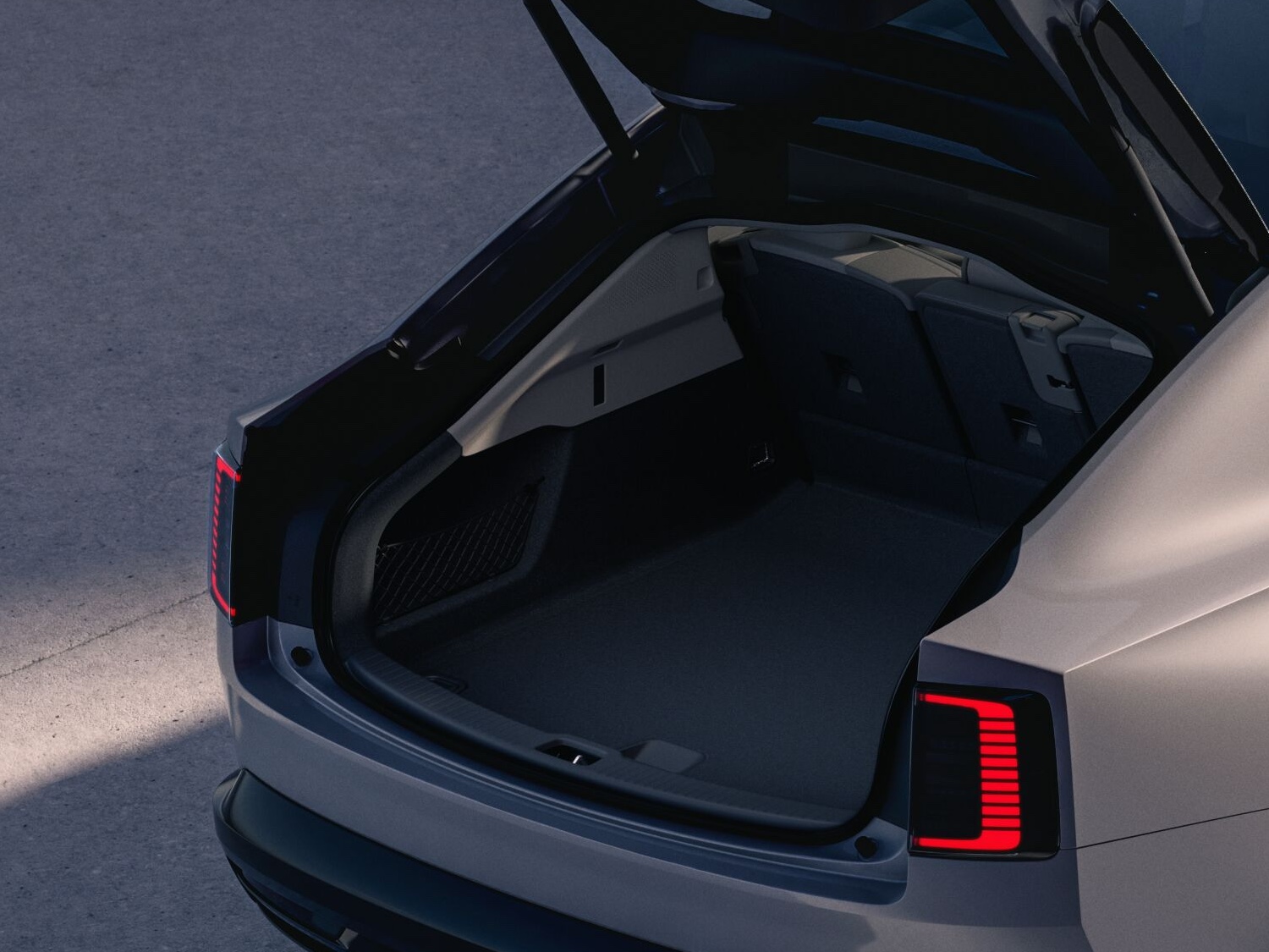 The boot of your ES90 holds up to 424 l litres. Its flat floor and wide opening make loading simple. Fold the rear seat backrests down to add space. Open and close the power-operated tailgate hands-free with a kick under the bumper. You can also use buttons on the tailgate and centre display.